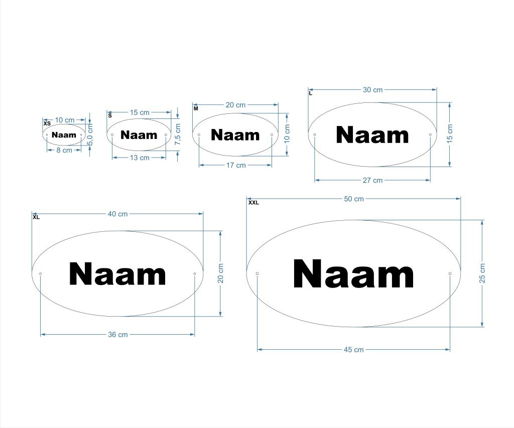 De hoogte van de letters is afhankelijk van het aantal letters, hier wordt altijd een mooie verdeling voor gemaakt. Er kunnen ca. 12 letters achter elkaar staan, is de naam langer geef dan met een vertikale streep '|' aan waar de naam moet worden afgebroken, dan komt dat gedeelte op een tweede regel. Dit kun je eventueel ook nog toelichten bij het afronden van de bestelling.